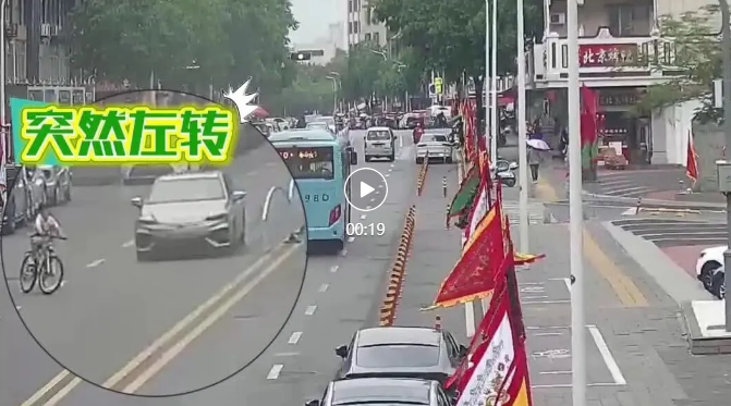 2023年8月24日晚,鲜某醉酒驾驶电动自行车时,因未注意观察前方路况,与李某某违法停留的重型半挂牵引车(防护装置、反光标识安全状态不符合要求)发生碰撞。经认定,鲜某负事故主要责任,李某某负事故次要责任。 法律链接 《中华人民共和国道路交通安全法》 第五十七条 “驾驶非机动车在道路上行驶应当遵守有关交通安全的规定。非机动车应当在非机动车道内行驶;在没有非机动车道的道路上,应当靠车行道的右侧行驶。” 《中华人民共和国道路交通安全法》 第五十六条 “机动车应当在规定地点停放。禁止在人行道上停放机动车;但是,依照本法第三十三条规定施划的停车泊位除外。在道路上临时停车的,不得妨碍其他车辆和行人通行。” 交警提醒 机动车驾驶人要将车辆合法停放在安全区域,因违法停车行为引发的交通事故,违停驾驶人需承担相关事故责任。 非机动车驾驶人要规范佩戴安全头盔,按道行驶,严禁酒后骑行、不乱行乱闯。 04 自行车马路上左拐,撞了! 2025年4月12日下午,李某某驾驶小型新能源车行驶至公交车站时,未注意观察周围路况,遇许某某驾驶自行车突然左转时发生碰撞,造成许某某受伤及车辆受损的道路交通事故。经认定,许某某负事故主要责任,李某某负事故次要责任。 法律链接 《中华人民共和国道路交通安全法实施条例》 第七十条第一款 “驾驶自行车、电动自行车、三轮车在路段上横过机动车道,应当下车推行,有人行横道或者行人过街设施的,应当从人行横道或者行人过街措施通过;没有人行横道、没有行人过节设施或者不便使用行人过街设施的,在确认安全后直行通过。“ 交警提醒 行人、非机动车驾驶人应通过天桥、地下通道、人行横道等过街设施横过道路,遵守交通信号灯指示通行。非机动车过街时还需下车推行,提升避险反应能力。 节目回放
