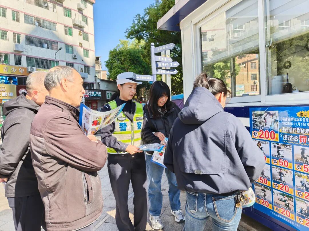 形式多样:营造浓厚氛围 宁德交警采用了多种宣传形式,通过宣传单页、展板、海报、横幅、LED屏等直观方式,向市民传递新规主要内容。精心设计的宣传材料以图文并茂的形式呈现,简洁明了地展示了新规要点,让过往群众一目了然,在短时间内就能掌握关键信息,提升了宣传效果。 01 发放宣传单页