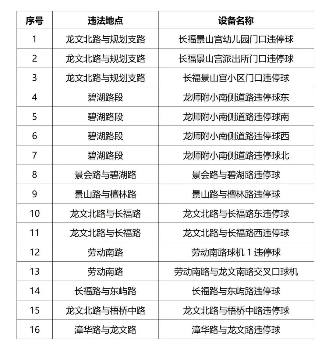 为进一步规范我区道路交通秩序,提升城市交通管理水平与文明程度,为广大群众出行创造安全畅通的交通环境。漳州市公安局交通管理支队龙文大队现将辖区内新增的16个交通违法采集设备安装地点、违法行为内容公告如下,并依照《中华人民共和国道路交通安全法》有关规定对违法车辆进行抓拍处罚,望广大驾驶人员相互转告,自觉遵守交通法律法规,安全文明出行,共同维护道路交通秩序。