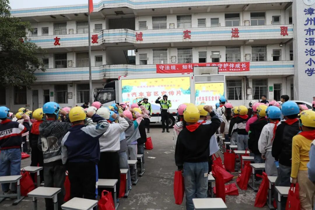 漳州市公安局交通管理支队向浯沧小学捐赠儿童安全头盔200顶,用于支持学校日常交通安全教育,民警还和孩子们立下“平安”约定。