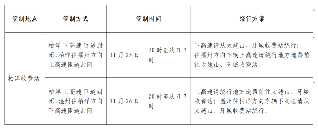 关于沈海高速柏洋收费站实施封闭施工交通管制的通告 为确保沈海高速柏洋收费站匝道路面养护工程施工有序进行,根据《中华人民共和国道路交通安全法》第三十九条和《中华人民共和国道路交通安全法实施条例》第三十五条等规定,现对柏洋收费站匝道进行封闭施工,具体交通管制如下: 一、管制时间、地点及绕行方案