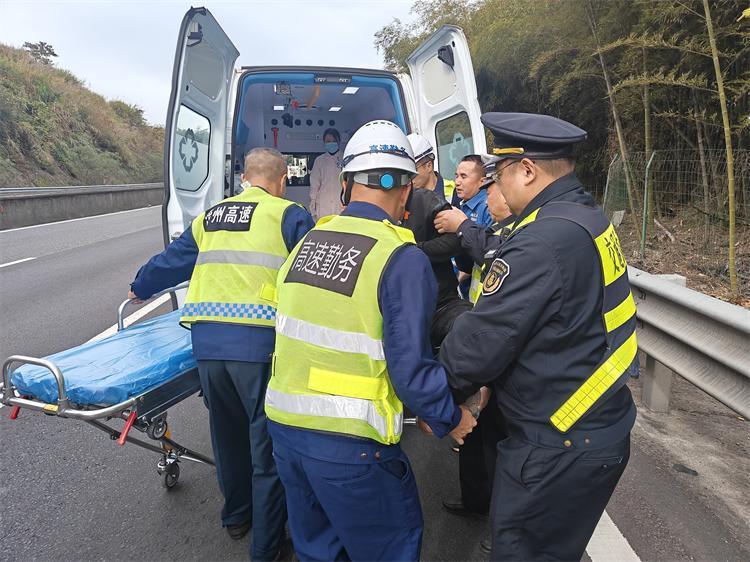 接报后,执法人员立即启动“5+N”联勤联动机制,联合辖区交警、高速路勤、120急救中心等单位火速赶赴现场。抵达现场时,执法人员发现张师傅已被前车驾驶员拉出坐于路旁,嘴角有血渍但意识尚清醒。执法人员立即上前安抚:“师傅,别慌,我们都在,医护人员马上就到!” 随后,执法人员分线作战,一组配合交警对事故路段进行安全布控,设置警示标志,提醒后方来车减速慢行;另一组则协助医护人员,小心翼翼地将张师傅抬上担架,协同将伤员转运至救护车,由医护人员将其送往龙岩第二医院进行进一步检查。