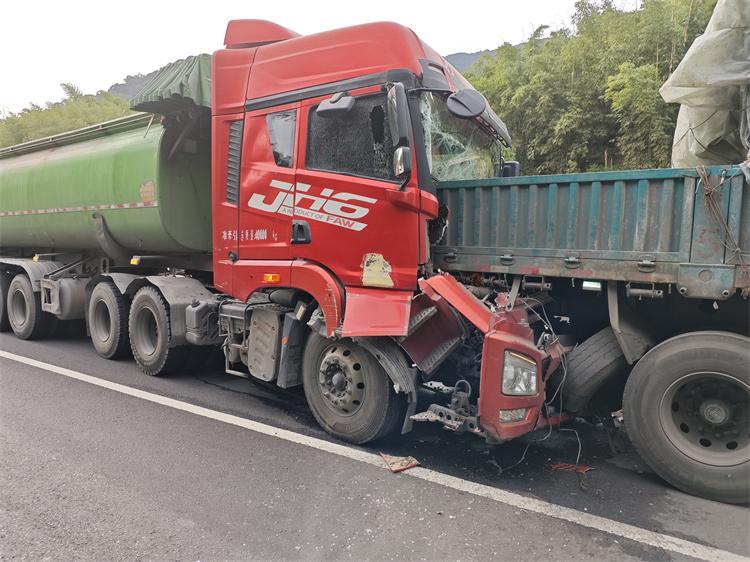 11月27日14时35分,漳州高速执法支队三大队接到紧急报告,厦蓉高速A108k+600m路段突发两辆货车追尾事故,占用主车道,后车车头严重变形,驾驶员张师傅受伤。