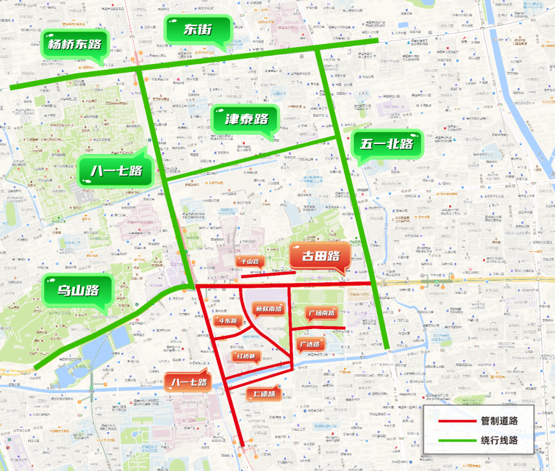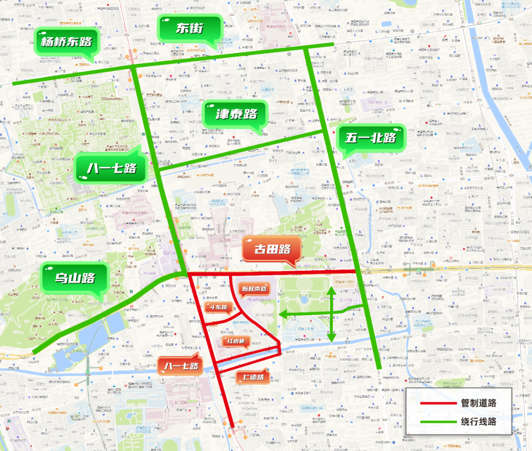 12月14日3点至7点绕行线路 管制期间,过境车辆可由乌山路、八一七路、津泰路、杨桥东路、东街、五一北路绕行。