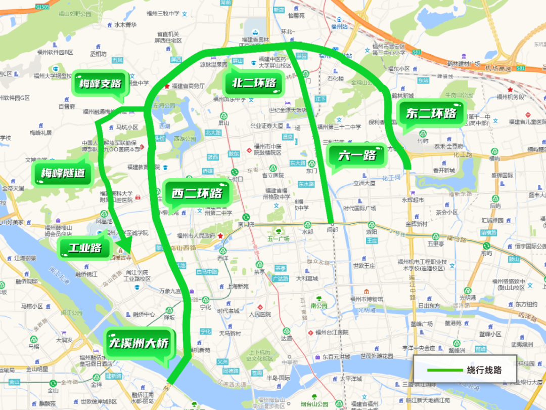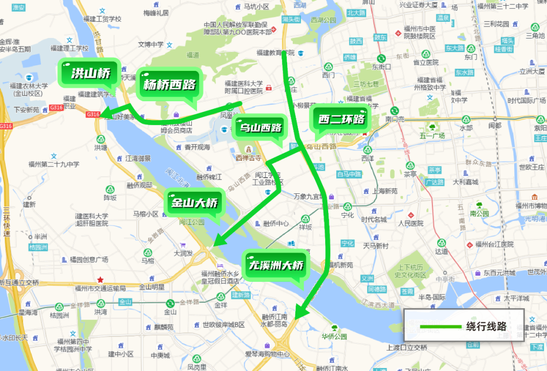 03 杨桥中路、东街赛道以北区域 赛事交通管制期间(12月14日7:00至赛事结束)欲前往台江、仓山方向的车辆,可选择以下绕行线路: 1、沿北二环路——东二环路或六一路往南方向通行; 2、沿西环北路——梅峰支路——梅峰路——梅峰隧道——工业路往南方向通行; 3、沿西二环路——尤溪洲大桥往南方向通行。