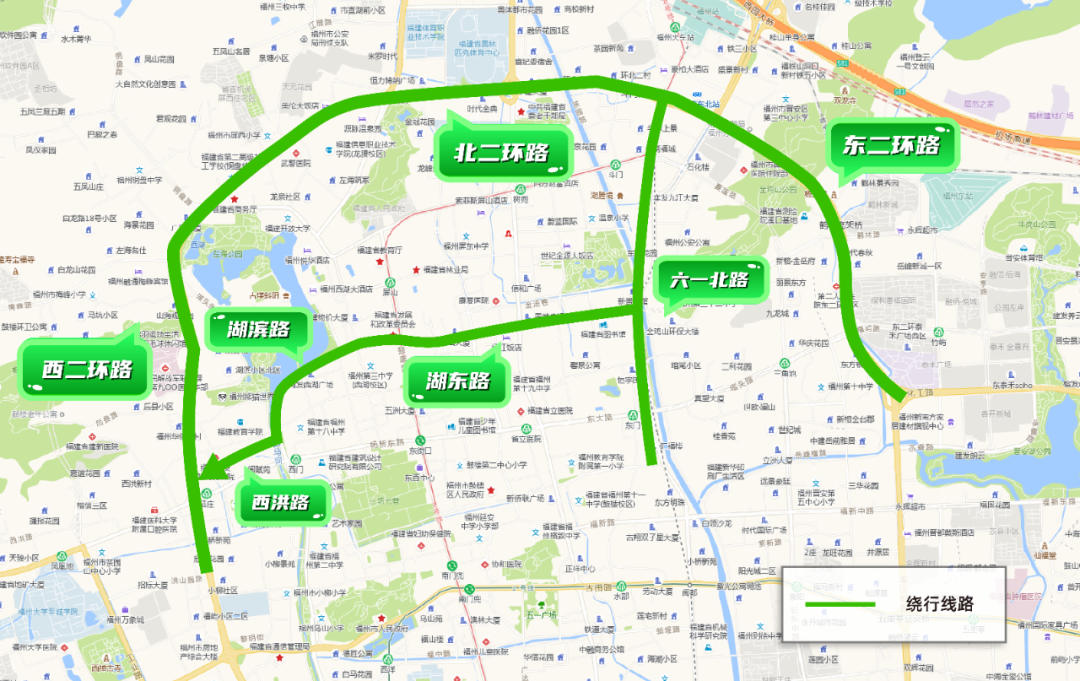 12月14日7点至赛事结束绕行线路 管制期间,过境车辆可由西二环路、北二环路、东二环路、六一北路绕行;往西通行的车辆还可由湖东路——湖滨路——西洪路方向绕行。