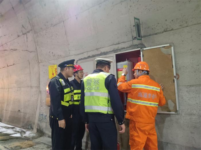 在确认主线道路基础设施完好有效后,执法人员将关注重点转移至隧道的安全管理检查。在消防设施方面,执法人员详细查验了消火栓水压、水带接口完好性及灭火器压力值的有效性,并对应急照明灯具、疏散指示标志的亮度和响应情况进行实测。此外,执法人员还对隧道外报警电话设备进行逐一测试,确认其在使用时能做到联络畅通、语音清晰。对于排查过程中发现的部分灭火器临近有效期等隐患,执法人员详细记录,与高速养护部门现场进行对接,明确整改完成时限。