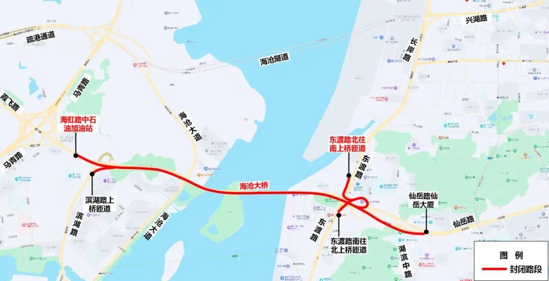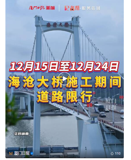 2025年12月15日至12月24日,每日0:00-5:30,海沧大桥双向封闭施工,禁止机动车通行,受限机动车请绕行东渡路、长岸路、仙岳路、兴湖路、海沧隧道、马青路、疏港通道及海沧大道等周边道路。 车辆绕行路径