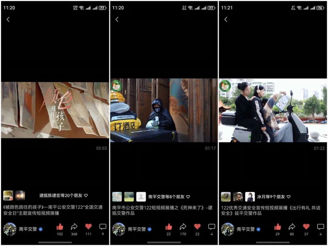 与此同时,南平市公安局交警支队结合文明交通主题开展了公益宣传短视频展播活动,创作了一批优秀交通安全宣传短视频。