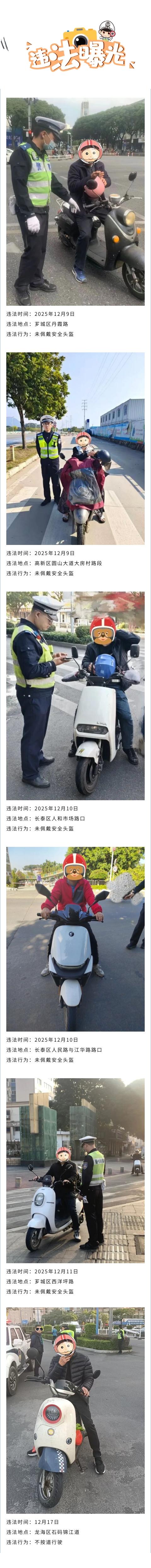 二、三轮车(摩托车、电动自行车)因灵活便捷,成为日常出行常用工具。但由于其稳定性相对较差、车身缺乏结构性防护,在行驶中一旦发生碰撞或侧翻,驾乘人员头部往往直接受到冲击,易导致颅脑损伤等致命后果。正确佩戴头盔,是减轻伤害、保护生命安全的关键举措。 然而 “戴了头盔发型会乱!” “离得很近,一会儿就到,不戴没事儿!” ...... 纵使交警千叮咛万嘱咐, 一提头盔总有人心存侥幸“不戴!” 现对近期部分违法行为予以曝光 希望广大交通参与者引以为戒、文明出行