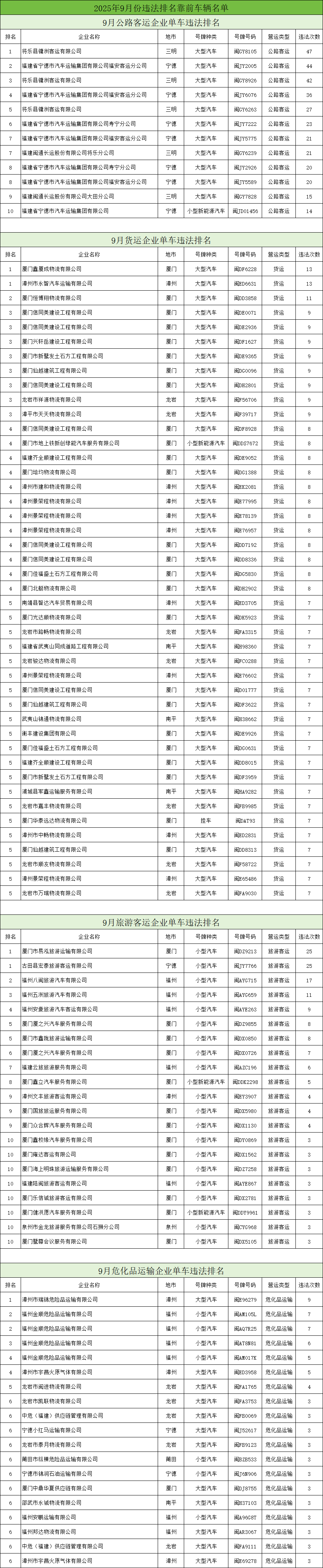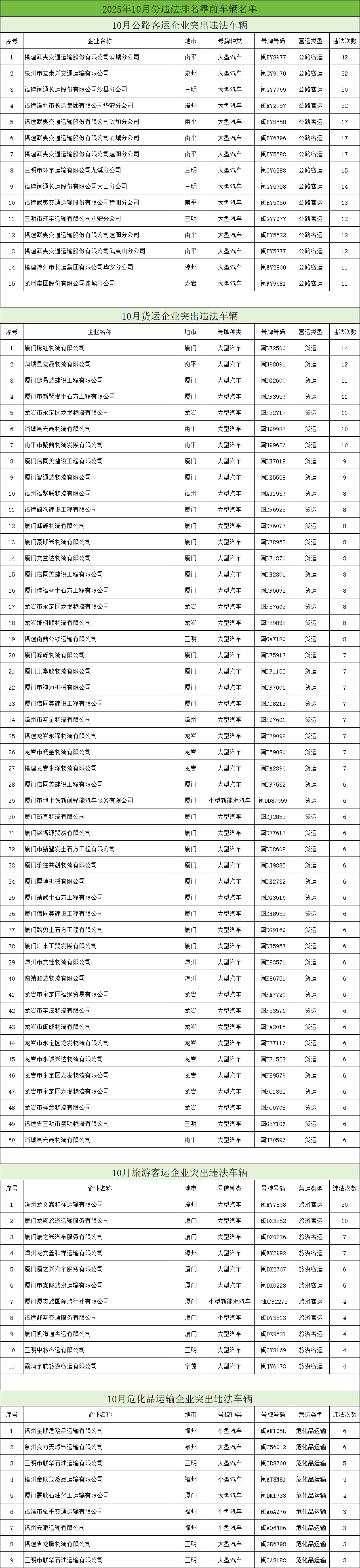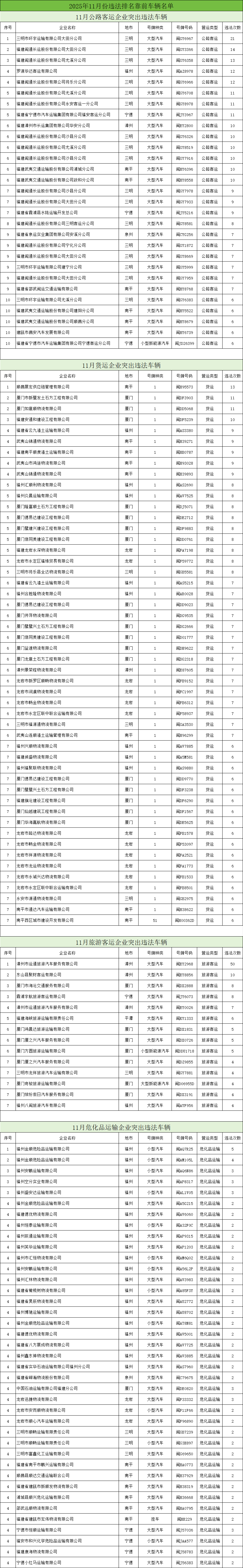 东南网12月18日讯(本网记者 翁莉 通讯员 陈浩)日前,省公安厅交通管理总队曝光2025年9至11月期间,交通违法总量居前的公路客运、普通货运、旅游客运、危险货物运输四类企业及车辆名单。此次曝光旨在通过公开警示,督促相关企业及驾驶人切实履行交通安全主体责任,强化道路交通安全隐患排查整治,从源头预防和减少道路交通事故,全力保障我省道路交通安全形势持续稳定。 当前冬季低温雨雪雾天气多发,福建山区易路面结冰、能见度下降,叠加年底货运繁忙、返乡客流增加,交通安全风险上升。交警提醒:企业需落实主体责任,加强驾驶人冬季安全培训,排查车辆隐患,杜绝 “带病车” 上路;驾驶人要严守交规,避超速、酒驾等行为,提前查路况,恶劣天气减速控距、谨慎驾驶,勿疲劳驾驶;公众选正规车辆出行,系好安全带,自驾前检查车辆、携带应急工具,遇拥堵或事故听从交警指挥。交警将持续严查重点违法,呼吁各方筑牢冬季交通安全防线。