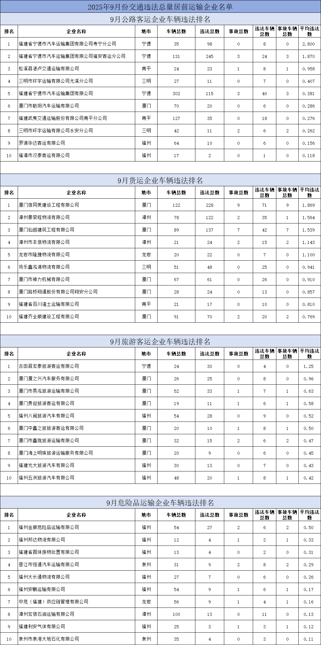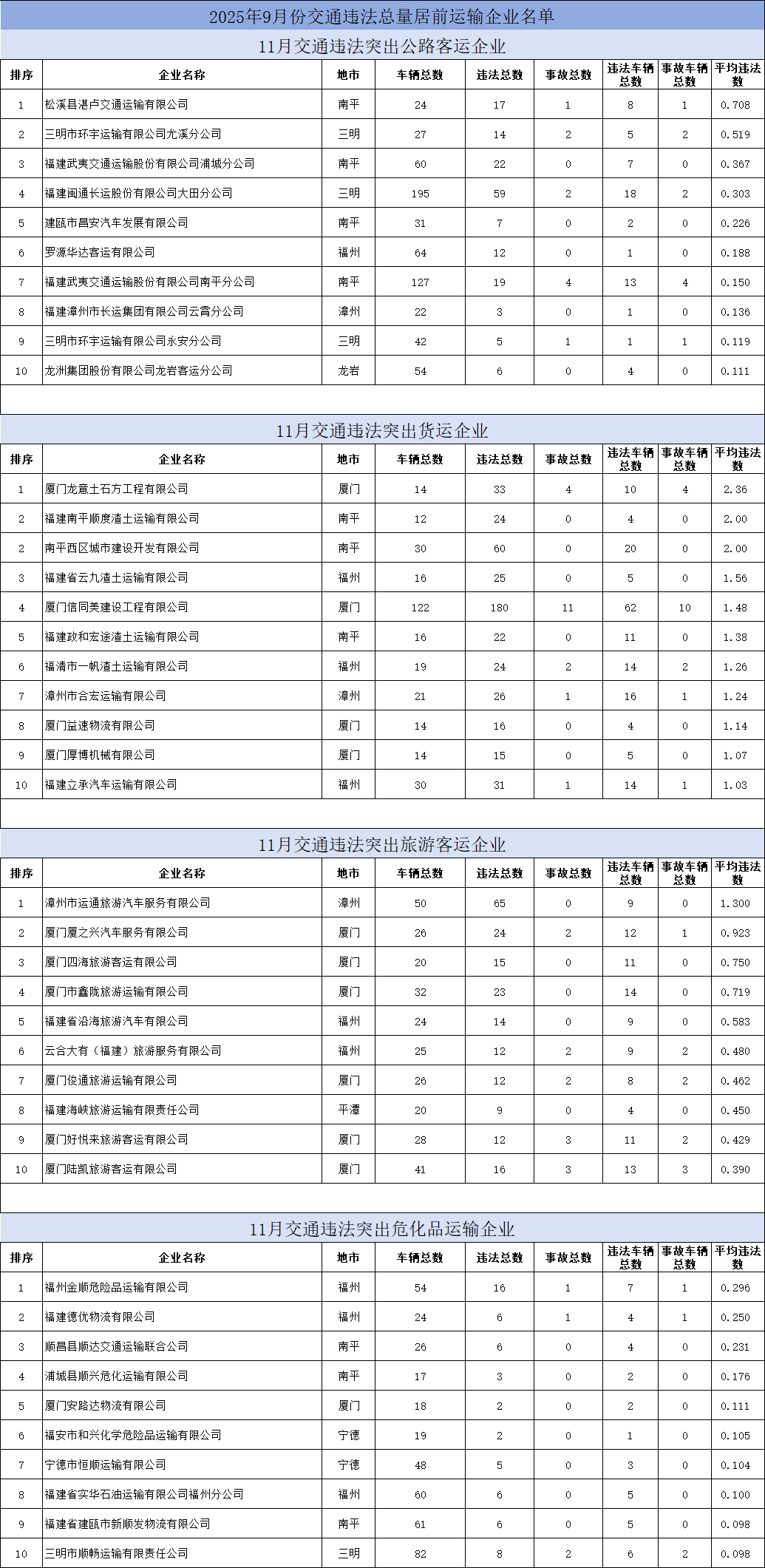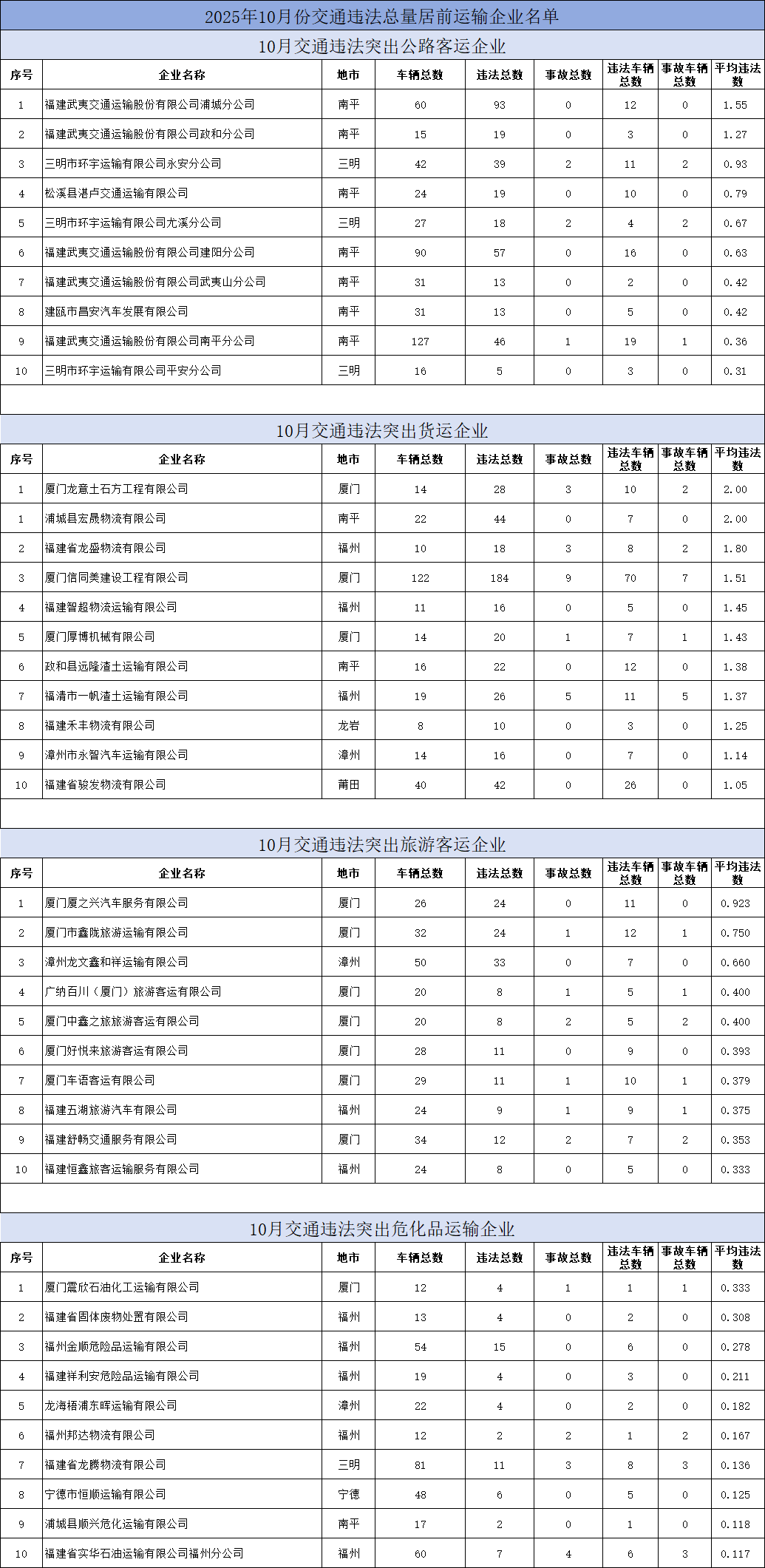 东南网12月18日讯(本网记者 翁莉 通讯员 陈浩)日前,省公安厅交通管理总队曝光2025年9至11月期间,交通违法总量居前的公路客运、普通货运、旅游客运、危险货物运输四类企业及车辆名单。此次曝光旨在通过公开警示,督促相关企业及驾驶人切实履行交通安全主体责任,强化道路交通安全隐患排查整治,从源头预防和减少道路交通事故,全力保障我省道路交通安全形势持续稳定。 当前冬季低温雨雪雾天气多发,福建山区易路面结冰、能见度下降,叠加年底货运繁忙、返乡客流增加,交通安全风险上升。交警提醒:企业需落实主体责任,加强驾驶人冬季安全培训,排查车辆隐患,杜绝 “带病车” 上路;驾驶人要严守交规,避超速、酒驾等行为,提前查路况,恶劣天气减速控距、谨慎驾驶,勿疲劳驾驶;公众选正规车辆出行,系好安全带,自驾前检查车辆、携带应急工具,遇拥堵或事故听从交警指挥。交警将持续严查重点违法,呼吁各方筑牢冬季交通安全防线。