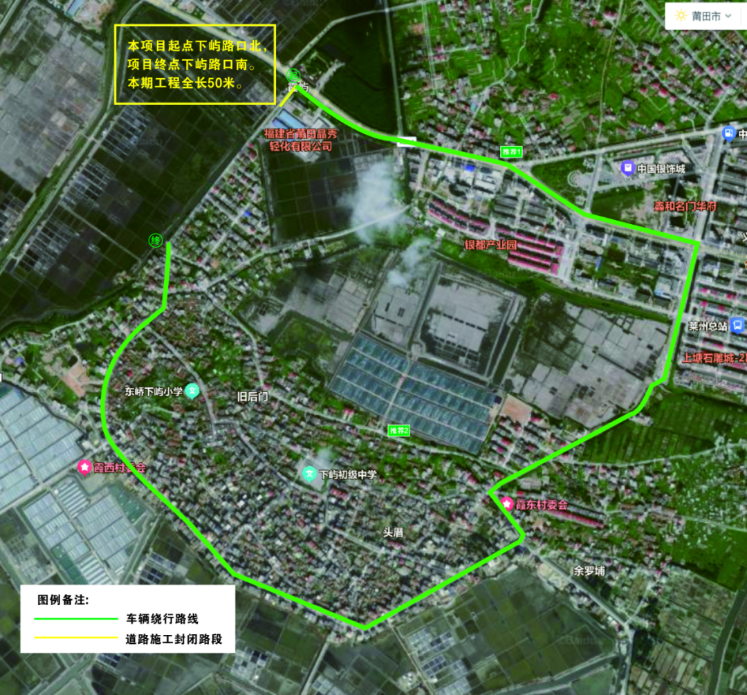 莆田市公安局交通管理支队秀屿大队关于秀屿区东峤镇霞西村霞屿路口占道施工交通管制的通告 因秀屿区东峤镇霞西村霞屿路口彩门建设工程施工需要,为保证施工期间道路交通安全、畅通,根据《中华人民共和国道路交通安全法》第三十九条规定,决定对东峤镇霞西村霞屿(下屿)路口实行临时交通管制。 具体通告如下: 一、管制时间 2025年12月20日-2025年12月25日 二、管制要求 施工路段实行全封闭交通管制,禁止车辆通行,请根据以下图示要求绕行。