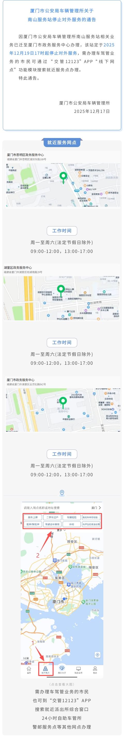 厦门交警:关于车辆管理所南山服务站停止对外服务的通告