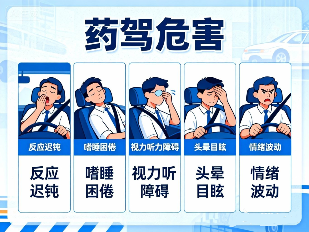 01 无声的威胁—— 药驾的巨大危害远超想象 所谓“药驾”,是指驾驶员服用了某些可能影响安全驾驶能力的药物后,仍然驾驶机动车的危险行为。这些药物通过对中枢神经系统、感官系统或身体机能的作用,严重削弱驾驶员的驾驶能力。 案例1 感冒发烧吃药后上路困意来袭 12月11日9时30分许,福银高速江西抚州段,刘某驾车行驶时,车辆忽然失控向右偏离车道,撞上路边标志牌及护栏。刘某称自己感冒发烧,早上刚吃了药,行至事发地点时突然困意发作,“前一秒还是清醒的,一下子就昏了”,从而引发事故。 案例2 吃降压药后摇摇摆摆开车 11月22日20时许,泉南高速江西永新段,交警在巡逻途中发现前方一辆小车行驶状态异常,在两车道间来回摇摆,且不时亮起刹车灯、压车道线行驶,严重影响通行安全,遂拉响警笛示警,并喊话引导驾驶人靠边停车。 经询问得知,驾驶人在一小时前吃了降压药,之后逐渐感觉困倦乏力、注意力难以集中,导致行驶状态异常。交警帮其将车开到前方收费站,叮嘱其好好休息,待身体状态完全恢复、确认安全后再出发。