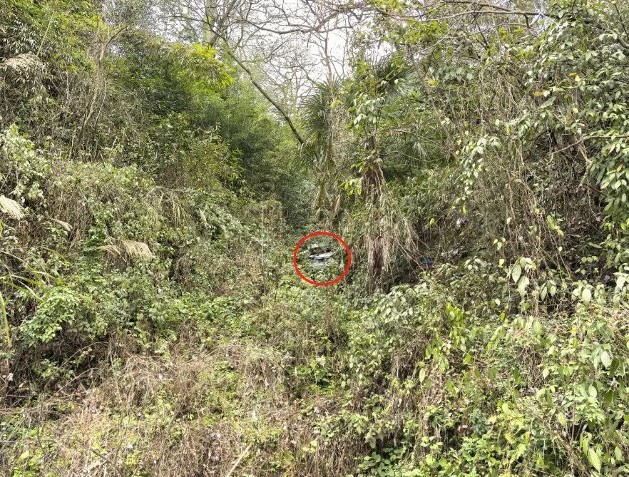 △车辆坠落位置(事故次日拍摄) 2025年2月24日晚,贵州凯里龙场镇箐口村。一辆载有一家五口的车辆在雨天经过乡道急弯时,因路面湿滑、雾气较大,司机操作失误导致车辆坠崖。万幸,车内人员仅受轻微擦伤,均无大碍。