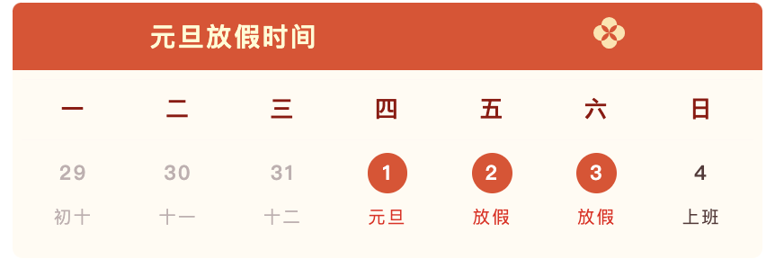 2026年元旦假期为1月1日(星期四)至1月3日(星期六)。节日期间,高速公路不施行小型客车免费通行政策。伴随中短途自驾出行、返乡探亲需求增大,预计高速公路及景区周边道路车流将小幅增加,高速公路出入口日均总流量约290万辆次。