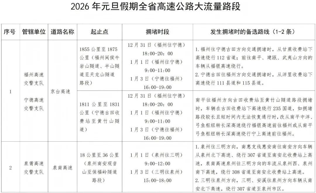 一、天气预测 全省天气整体呈先阴后雨,昼夜温差大。1月1日全省天气阴转晴;1月2日多云转中雨,我省中北部地区雨势较为明显;1月3日全省普遍中雨天气。 二、出行趋势预测 假期道路交通整体将出现三次潮汐式流量高峰。车流量高峰预计分别为:2025年12月31日下午(节前第一天)17时至20时;2026年1月1日上午9时至12时(假期第一天)将出现出程车流高峰,车流量将明显增大;1月2日流量将保持平稳,预计1月3日15时至18时为返程流量高峰,20时后逐步恢复常态运行。 三、大流量点段 (一)大流量路段 全省主要缓行路段分布:京台高速福州闽侯半山隧道至宁德古田排头枢纽路段、泉南高速泉州南安观音山隧道至保福岭隧道路段、沈海高速泉州南安水头路段、甬莞高速漳州南靖公山尾隧道至高梨山隧道路段、厦蓉高速龙岩上杭豪岭隧道路段。