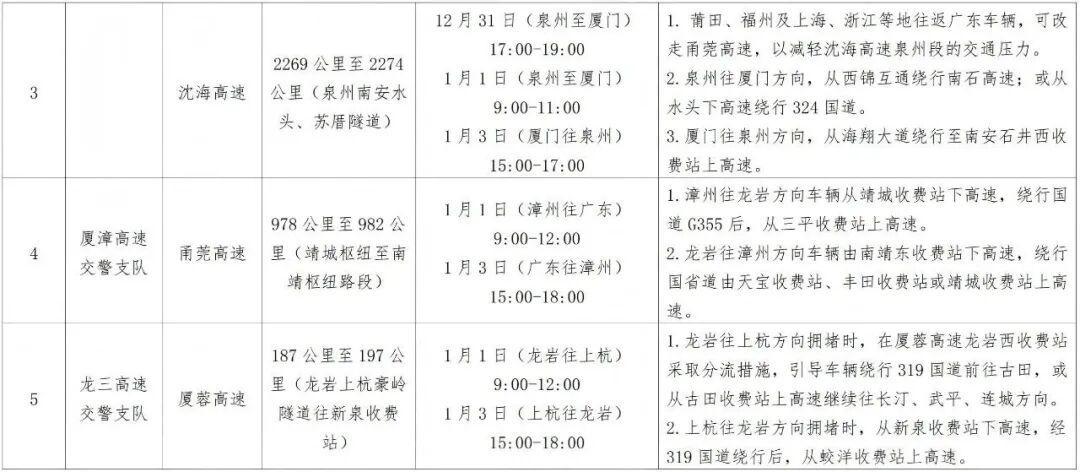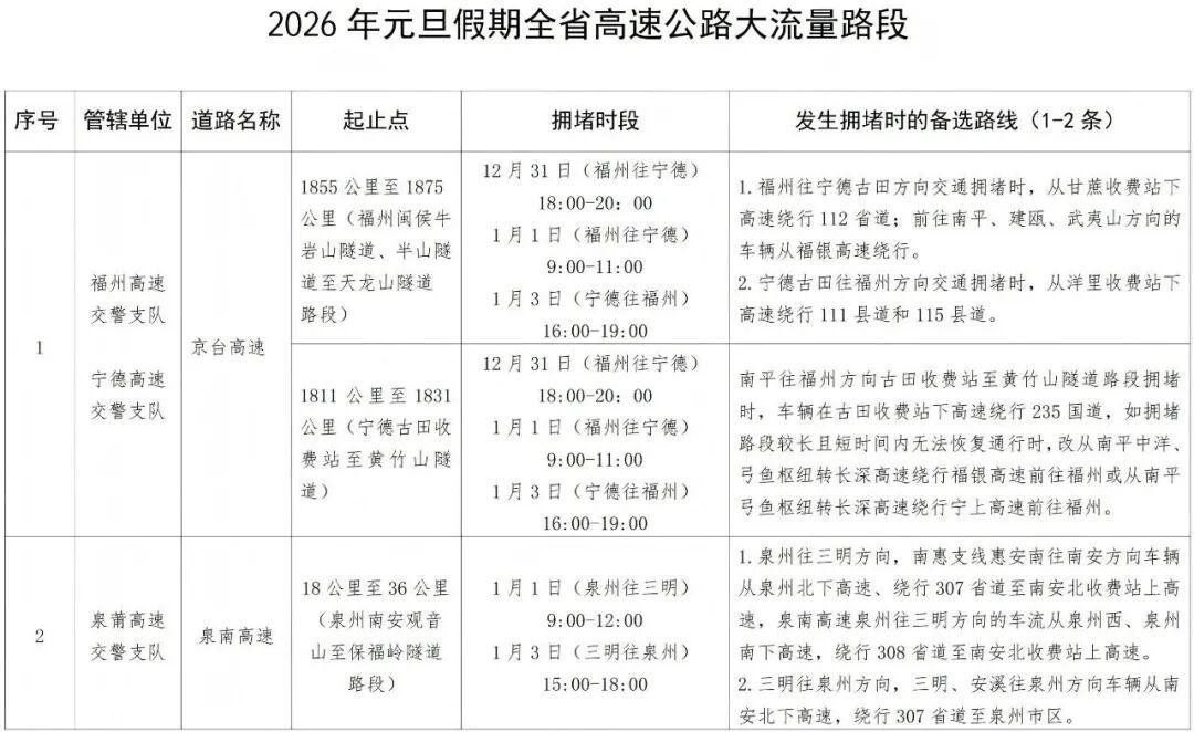 清源山游人如织(郑银杰 黄梓濠 摄) 同程旅行数据显示,12月29日前后,深圳至泉州、广州至厦门等跨省线路车票预订量激增,部分车次一等座甚至需要候补购票。这一现象折射出年轻群体“拼假”出行的趋势——通过调休凑出5至6天长假,实现深度跨省游。 据飞猪平台数据,今年元旦假期,福建省旅游预订量实现倍数级同比增长。其中,当地玩乐预订量同比激增200%,租车服务预订量更是达到去年同期的4倍。厦门、福州、泉州位列省内最热门旅游城市前三名,而南平、莆田、漳州等地则成为增速最快的潜力目的地。 据了解,福州地铁将通过延时运营、延长高峰、增加运能等方式,全力保障跨年夜及元旦假期市民乘客出行需求。 元旦将至 福建交警发布 道路交通安全出行提示 ↓ 01天气预测 全省天气整体呈先阴后雨,昼夜温差大。1月1日全省天气阴转晴;1月2日多云转中雨,福建中北部地区雨势较为明显;1月3日全省普遍中雨天气。 02出行趋势预测 假期道路交通整体将出现三次潮汐式流量高峰。车流量高峰预计分别为:2025年12月31日下午(节前第一天)17时至20时;2026年1月1日上午9时至12时(假期第一天)将出现出程车流高峰,车流量将明显增大;1月2日流量将保持平稳,预计1月3日15时至18时为返程流量高峰,20时后逐步恢复常态运行。 03大流量点段 (一)大流量路段全省主要缓行路段分布: 京台高速福州闽侯半山隧道至宁德古田排头枢纽路段、泉南高速泉州南安观音山隧道至保福岭隧道路段、沈海高速泉州南安水头路段、甬莞高速漳州南靖公山尾隧道至高梨山隧道路段、厦蓉高速龙岩上杭豪岭隧道路段。