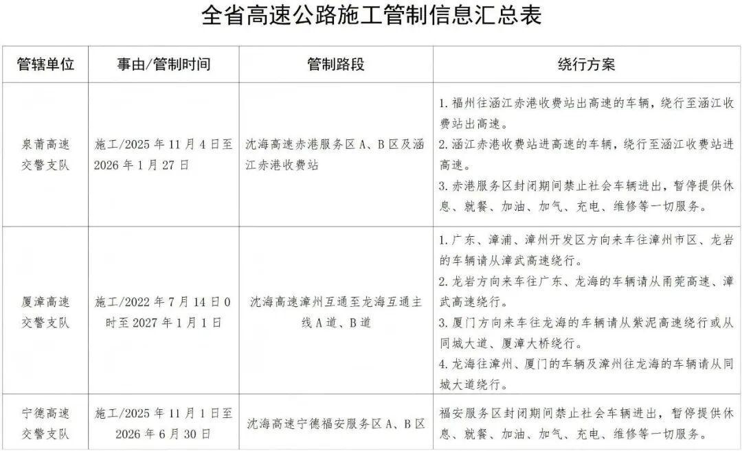 (二)大流量收费站 1.福州:祥谦收费站 2.厦门:厦门、翔安收费站 3.泉州:池店、晋江、泉州收费站 4.宁德:宁德南收费站 (三)大流量服务区 1.福州:大往服务区 2.厦门:龙掘东、东孚服务区 3.泉州;朴里、驿坂、洛阳江服务区 4.漳州:小溪服务区 04高速公路施工管控路段 全省高速公路因施工采取交通管制路段3处。