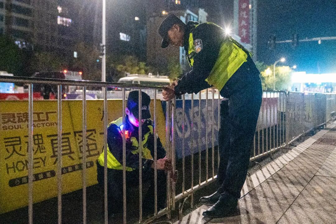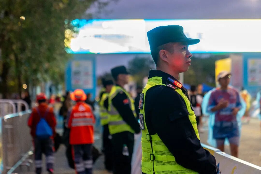 晨光熹微 天色未亮 民警辅警早已就位 细致检查赛事防护设施 协助引导选手有序入场 赛事途中的藏蓝身影 成为跑友们最安心的路标