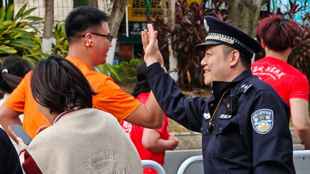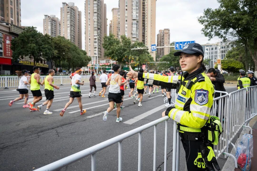 民警化身赛道边温暖的 “助威团” 每一次挥手致意 每一句暖心的“加油” 每一个竖起的大拇指 都为跑友们突破自我再添助力