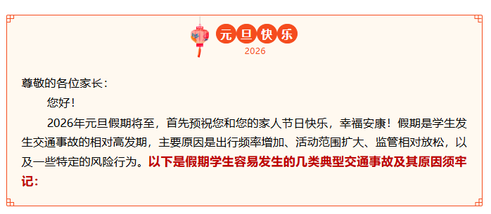 元旦假期学生交通安全出行守则 步行时要做“醒目”的人 不要做“隐形”人 过马路时走人行横道、过街天桥等过街设施,注意观察路况,杜绝突然加速横穿或在路中折返跑跳。 严格遵守交通信号灯指示,远离大车“盲区”,防止在马路上、车库出入口或车辆停车位周围逗留、玩耍,不在道路上使用滑板、旱冰鞋、电动平衡车等滑行工具。 骑行时要做“规矩”的骑手 不要做“冒险”家 未满12周岁不能骑行自行车上路,未满16周岁不骑电动自行车上路。 骑行时规范佩戴合格的安全头盔,转弯时提前减速,不双手离把、追逐打闹、不逆行、不闯红灯、不占用机动车道。 乘车时要做“谨慎”的乘客 不要做“大意”的人 乘坐正规的公交车、出租车或网约车,不要乘坐超员、无牌无证的“黑车”、三轮车或农用车。 乘坐汽车时,无论前后排均要系好安全带,不得将头、手等身体任何部位伸出车窗外或车顶天窗。 元旦假期 安全不放假 让我们携手为孩子们营造 一个安全、文明的交通环境 守护他们快乐度假,平安归来 部分来源:交规研究社 |