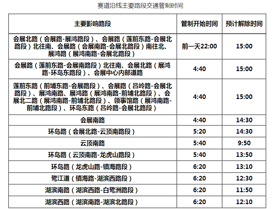 具体线路:厦门国际会展中心(起点)→会展路→会展南路→环岛东路→环岛南路→云顶南路(折返)→环岛南路→演武大桥→鹭江道→湖滨南路(折返)→湖滨西路(折返)→鹭江道→演武大桥→环岛南路→环岛东路→会展南路→会展路→厦门国际会展中心(终点)。 交通管制措施 为确保比赛安全顺利进行 会展北路、会展路、莲前东路 环岛路、鹭江道、升平路等 部分道路采取分时段交通限行措施 沿途交通管制