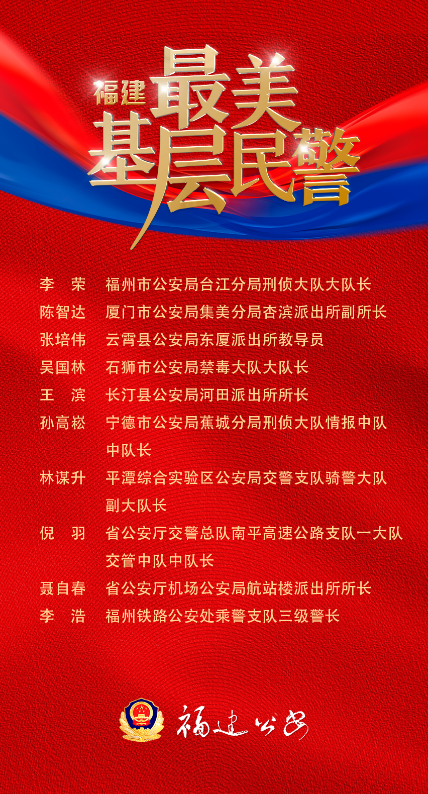 在第六个中国人民警察节即将到来之际,1月5日,2025福建省“最美基层民警”名单公布。根据省委宣传部、省公安厅关于开展2025福建省“最美基层民警”宣传选树活动工作安排,经组织推荐、集中宣传、现场评审,李荣、陈智达、张培伟、吴国林、王滨、孙高崧、林谋升、倪羽、聂自春、李浩等10名民警光荣当选。