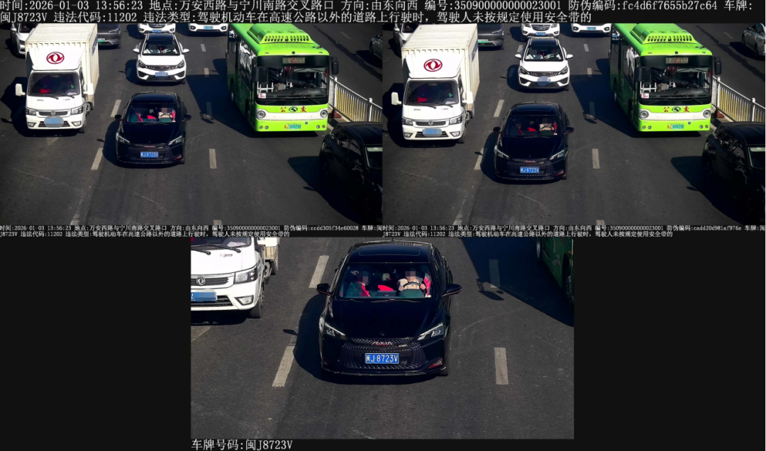 违法时间:2026/1/3 14:04 违法地点:蕉城南路与富春西路交叉路口 违法内容:驾驶机动车在道路上行驶时,机动车驾驶人未按规定系安全带 处罚措施:罚100元 记1分 闽J8723V 02