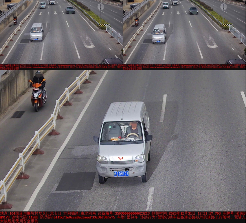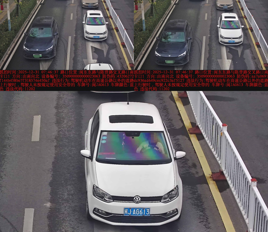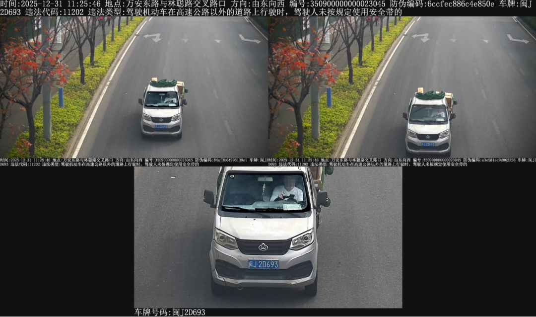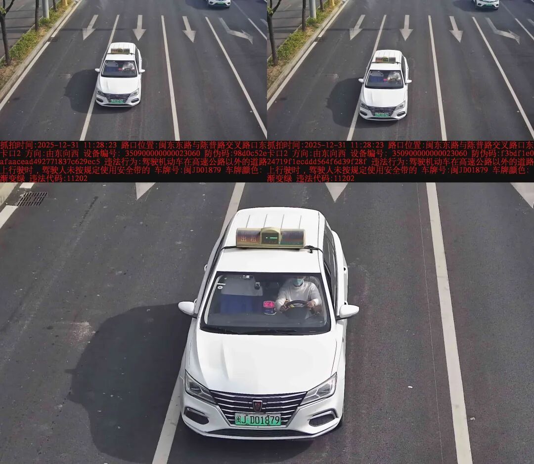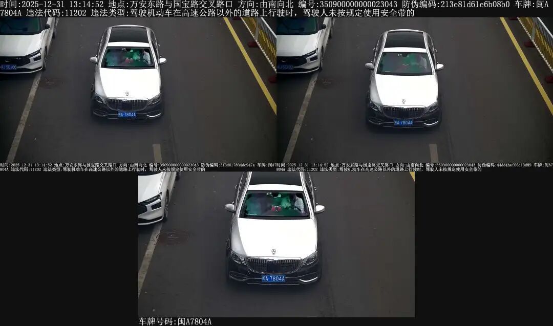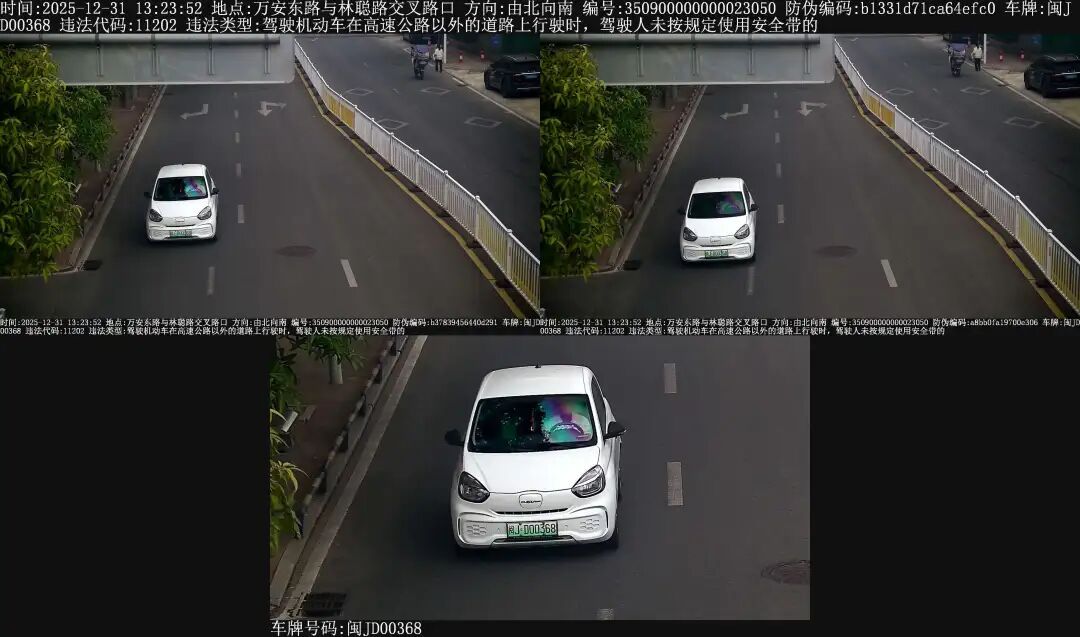 违法时间:2025/12/31 13:14 违法地点:国宝路与万安东路交叉路口南 违法内容:驾驶机动车在道路上行驶时,机动车驾驶人未按规定系安全带 处罚措施:罚100元 记1分 闽JQN179 014