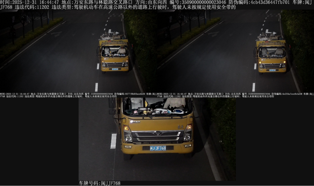 违法时间:2025/12/31 16:44 违法地点:林聪路与万安东路交叉路口东 违法内容:驾驶机动车在道路上行驶时,机动车驾驶人未按规定系安全带 处罚措施:罚100元 记1分 闽JJK008 010