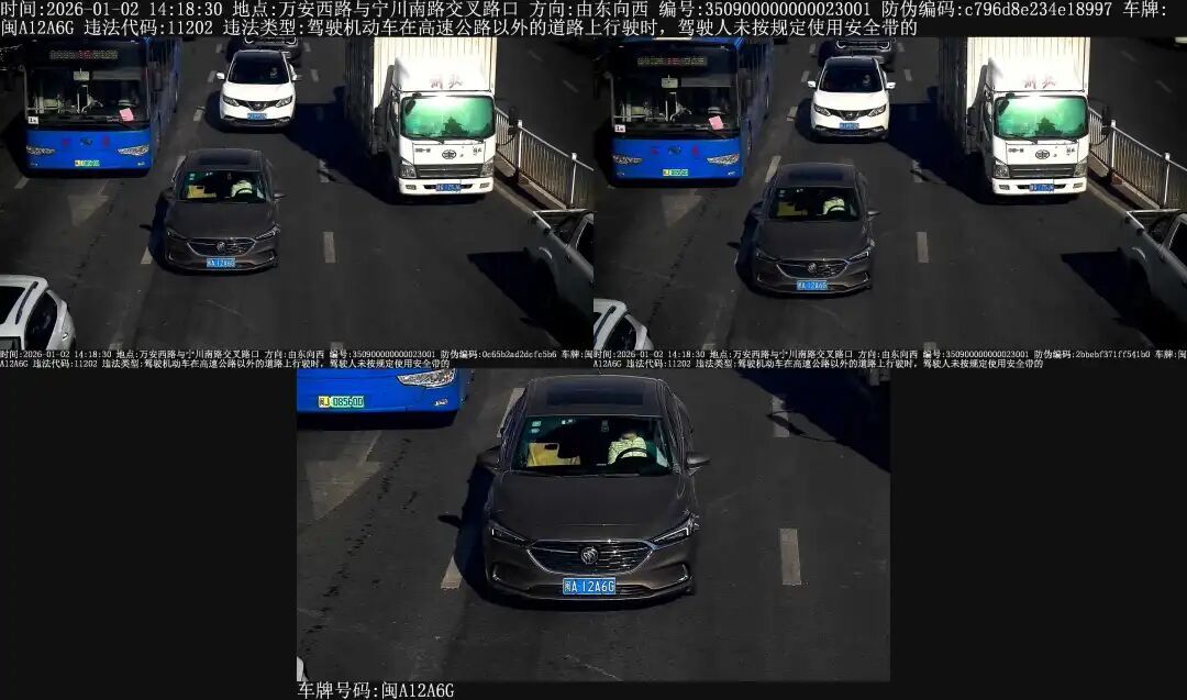 违法时间:2026/1/3 9:31 违法地点:蕉城南路与天湖西路交叉路口 违法内容:驾驶机动车在道路上行驶时,机动车驾驶人未按规定系安全带 处罚措施:罚100元 记1分 闽A12A6G 04