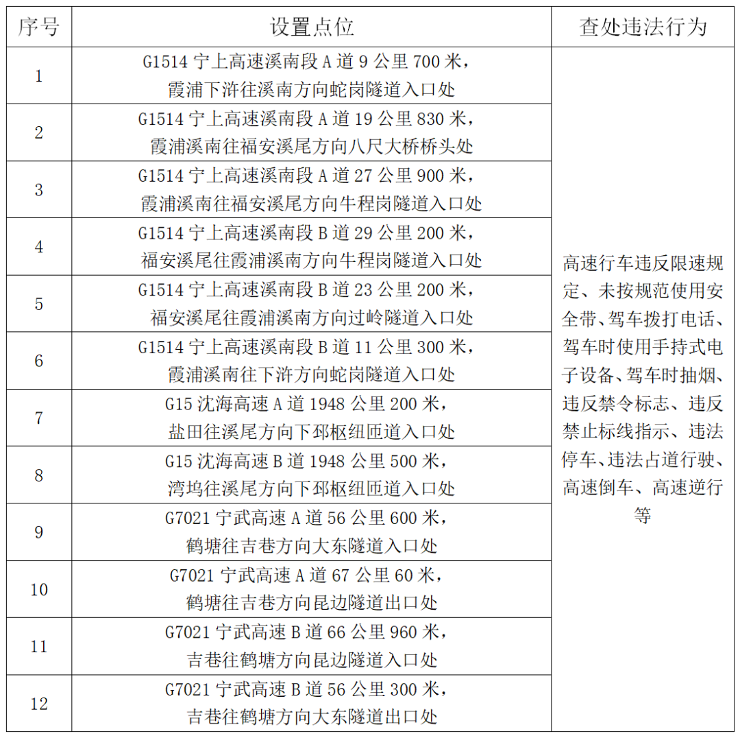 (图片可点击放大) 上述交通技术监控设备于2026年1月9日对社会进行公示,2026年1月20日0时正式启用,请广大驾驶人遵守交通安全法律法规,文明驾驶、安全出行。 特此通告。 福建省公安厅交通管理总队 宁德高速公路支队 2026年1月9日 |
