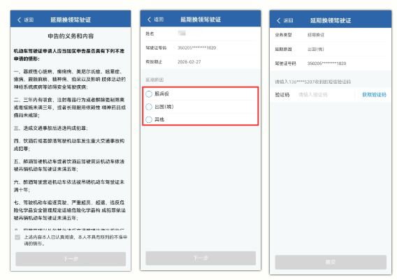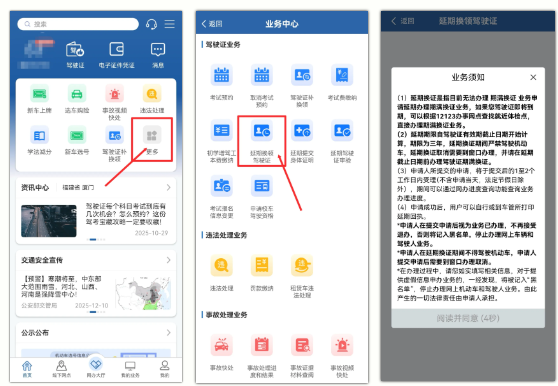 如果您因服兵役 出国(境)等特殊原因 无法按时办理驾驶证期满换证业务 您可以在驾驶证有效期内 或有效期届满一年内 通过“交管12123”APP 或到线下窗口办理 线上办理延期换证业务 01 办理须知 《驾驶证申领和使用规定》 (公安部令第172号)第七十五条 机动车驾驶人因服兵役、出国(境)等原因,无法在规定时间内办理驾驶证期满换证、审验、提交身体条件证明的,可以在驾驶证有效期内或者有效期届满一年内向机动车驾驶证核发地车辆管理所申请延期办理。申请时应当确认申请信息,并提交机动车驾驶人的身份证明。 延期期限最长不超过三年。延期期间机动车驾驶人不得驾驶机动车。 02 办理须知 有下列情形之一的,不得申请: ①有器质性心脏病、癫痫病、美尼尔氏症、眩晕症、癔病、震颤麻痹、精神病、痴呆以及影响肢体活动的神经系统疾病等妨碍安全驾驶疾病的; ②三年内有吸食、注射毒品行为或者解除强制隔离戒毒措施未满三年,以及长期服用依赖性精神药品成瘾尚未戒除的; ③造成交通事故后逃逸构成犯罪的; ④饮酒后或者醉酒驾驶机动车发生重大交通事故构成犯罪的; ⑤醉酒驾驶机动车或者饮酒后驾驶营运机动车依法被吊销机动车驾驶证未满五年的; ⑥醉酒驾驶营运机动车依法被吊销机动车驾驶证未满十年的; ⑦驾驶机动车追逐竞驶、超员、超速、违反危险化学品安全管理规定运输危险化学品构成犯罪依法被吊销机动车驾驶证未满五年的; ⑧因本款第四项以外的其他违反交通管理法律法规的行为发生重大交通事故构成犯罪依法被吊销机动车驾驶证未满十年的; ⑨因其他情形依法被吊销机动车驾驶证未满二年的; ⑩驾驶许可依法被撤销未满三年的; ⑪未取得机动车驾驶证驾驶机动车,发生负同等以上责任交通事故造成人员重伤或者死亡未满十年的; ⑫三年内有代替他人参加机动车驾驶人考试行为的; ⑬法律、行政法规规定的其他情形。 03 办理渠道 线上 / 办理流程 驾驶人可登录“交管12123”APP,在首页选择【更多】,选择驾驶证业务下的【延期换领驾驶证】,仔细阅读业务须知及申告的义务和内容。