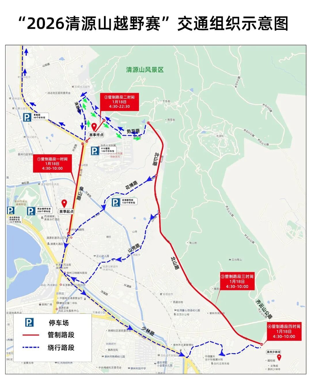 关于2026清源山越野赛期间 实施交通管制的通告 2026清源山越野赛将于1月18日在清源山风景区举办,为确保赛事期间辖区道路交通安全、有序、畅通,根据《中华人民共和国道路交通安全法》第三十九条规定,交警丰泽大队将于比赛当日根据道路交通实际情况,适时对泉山路、北山路、齐云山公路等周边道路实行临时交通管制。比赛期间将对部分道路采取分时、分段交通管制措施。管制措施如下: ①管制路段一 管制时间:1月18日4:30-10:00 管制措施:泉山路北侧道路,对单向车道进行管控,禁止所有车辆通行。 ②管制路段二 管制时间:1月18日4:30-22:30 管制措施:泉山路910环岛至清源山景区入口前,进行双向管控,双向禁止所有车辆通行。 ③管制路段三 管制时间:1月18日4:30-10:00 管制措施:北山路势至路路口至齐云路路口(少林寺后门),进行双向管控,双向禁止所有车辆通行。 ④管制路段四 管制时间:1月18日4:30-10:00 管制措施:齐云路路口(少林寺后门),进行双向管控,双向禁止所有车辆通行。