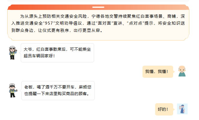 🚩 福鼎 逐户走访强灌输 安全要点记心间 交警采取“进店入户”方式,逐户讲解红白事中的交通安全要点,反复强调“9必讲、5告知、7必劝”,推动安全理念在办事前就深入人心。