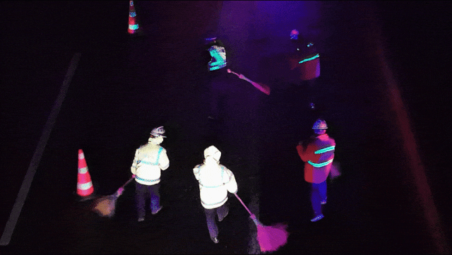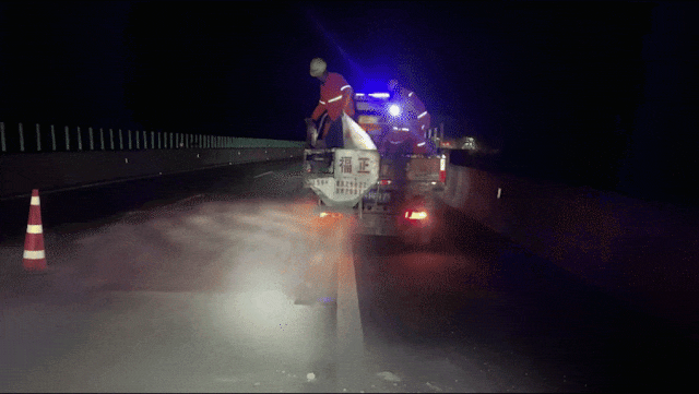 ▲三大队联合养护部门对易结冰桥梁点位铺撒融雪剂