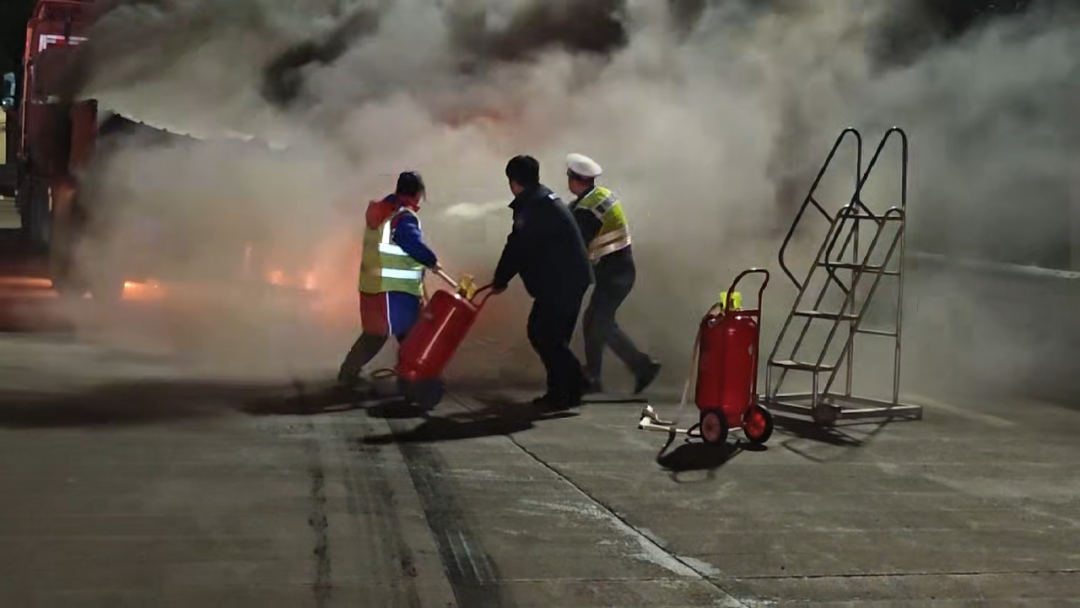 原来在12月31日晚,一辆大货车在行驶至飞鸾收费站路段时,轮胎突发自燃,在附近执勤的飞鸾中队民辅警闻讯赶到,发现现场火光冲天,考虑到收费站附近紧挨着加油站,火情一旦失控蔓延,将危及周边群众生命财产安全,现场民辅警在消防救援力量抵达前,前往加油站调用干粉灭火器,不顾浓烟熏呛的危险,对着火轮胎持续喷射。
