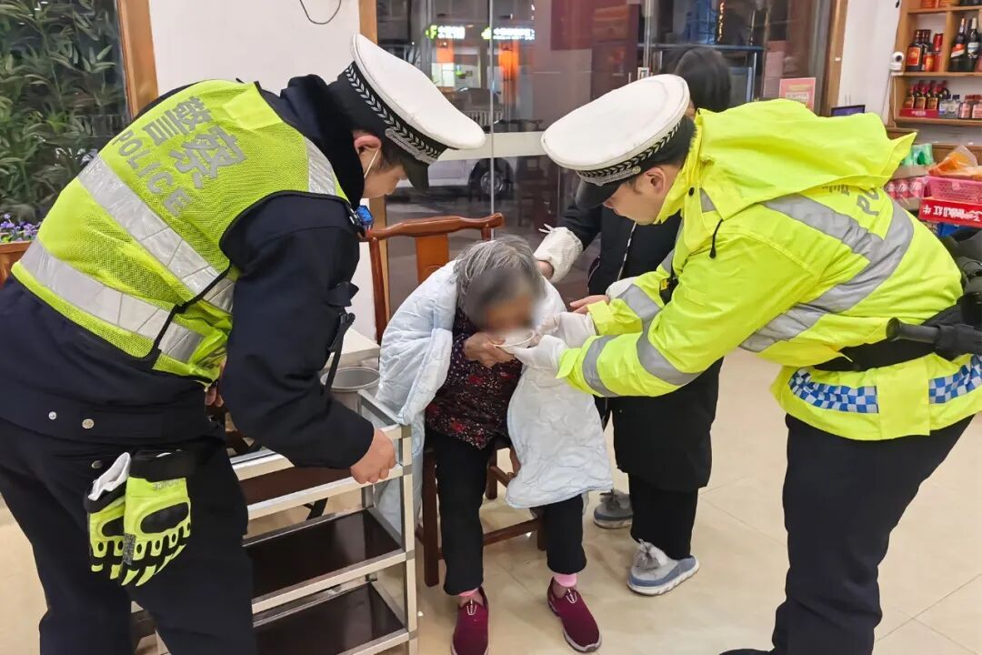 ▲搀扶老人到路边 后经询问得知 老人今年八十多岁 早上出门后不慎迷路 在路上辗转行走了一天 考虑到天气寒冷 交警和热心的餐馆老板 找来毛毯、倒上热水 为老人驱寒暖身