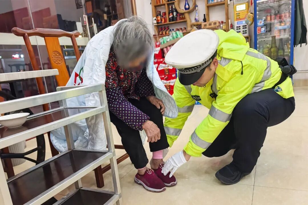 ▲交警喂老人喝热水 “老人家,您的脚抬起来” 见老人鞋子没穿好 交警蹲下身 为老人重新穿好鞋子