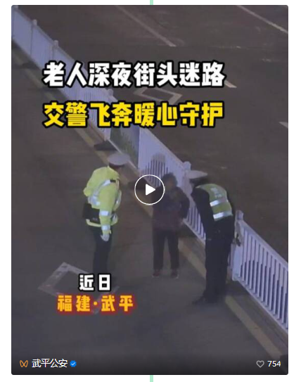 深夜冷风中 一名老人身处路中 执勤交警飞奔上前 一句轻声问候 一次耐心沟通 一碗热腾腾的汤面 不仅温暖了老人的身心 更让警民鱼水情 在冬日愈发浓厚 近日,福建武平 深夜气温骤降 一名老人独自 在道路中央隔离栏边徘徊 身影孤单,疑似迷路