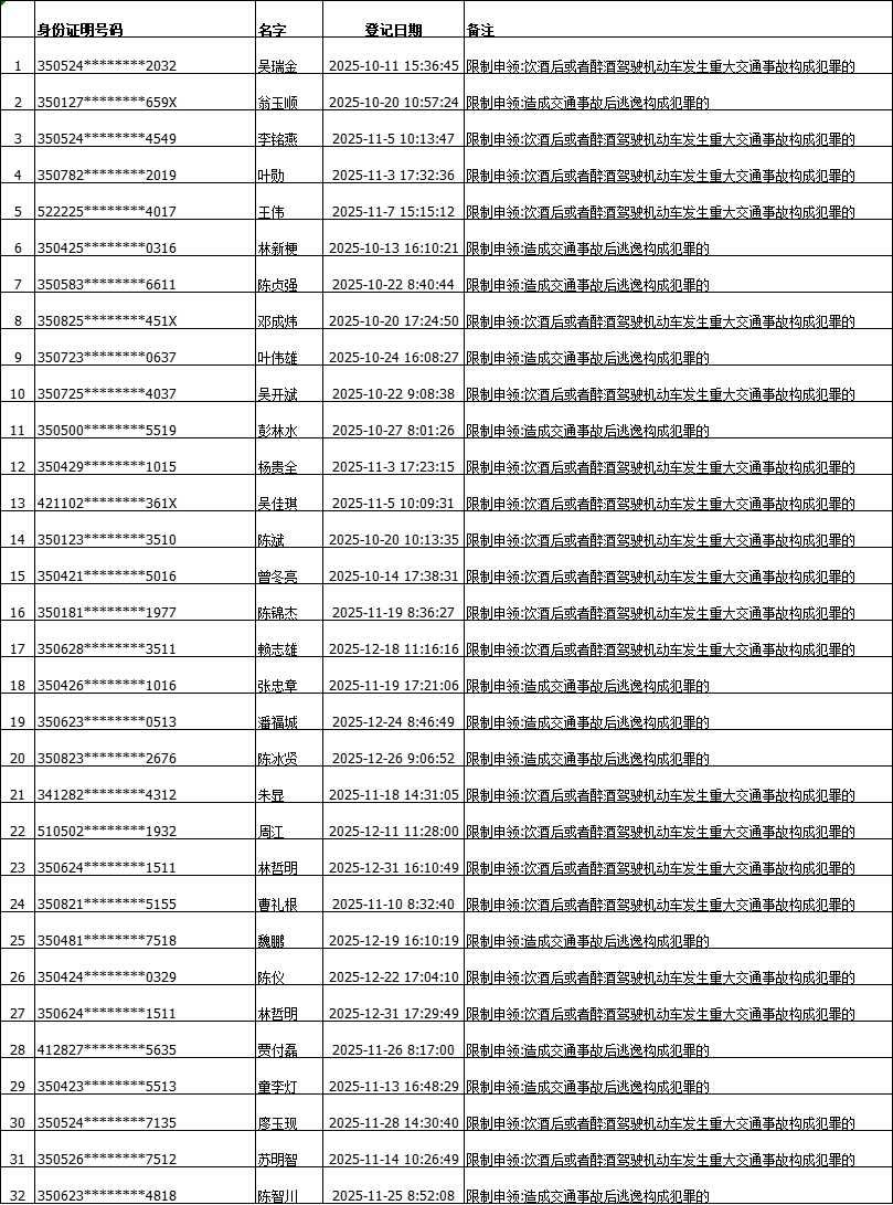 东南网2月4日讯(本网记者 翁莉 通讯员 陈浩)日前,福建省公安厅交通管理总队公布2025年第四季度终生禁驾名单,全省共32人被依法吊销机动车驾驶证,且终生不得重新申领。 此次禁驾人员中,12人因交通肇事后逃逸构成犯罪,20 人因饮酒或醉酒驾驶机动车发生重大交通事故构成犯罪,本季度无其他新增终生禁驾情形。 交警部门提示,依据《中华人民共和国道路交通安全法》,肇事逃逸、涉酒驾车引发重大事故并构成犯罪,均属法定终生禁驾情形。被列入“终生禁驾”名单人员将纳入动态监管,永久丧失驾驶资格,无证驾驶将依法追加处罚。 2025年第四季度终生禁驾名单