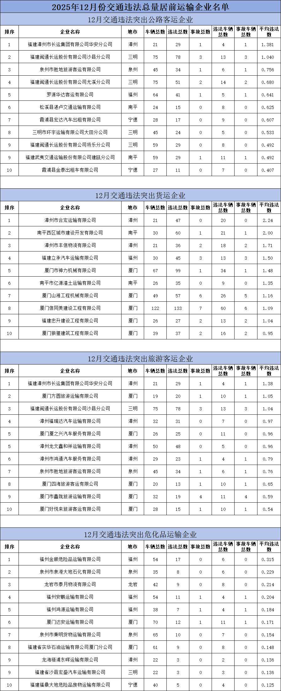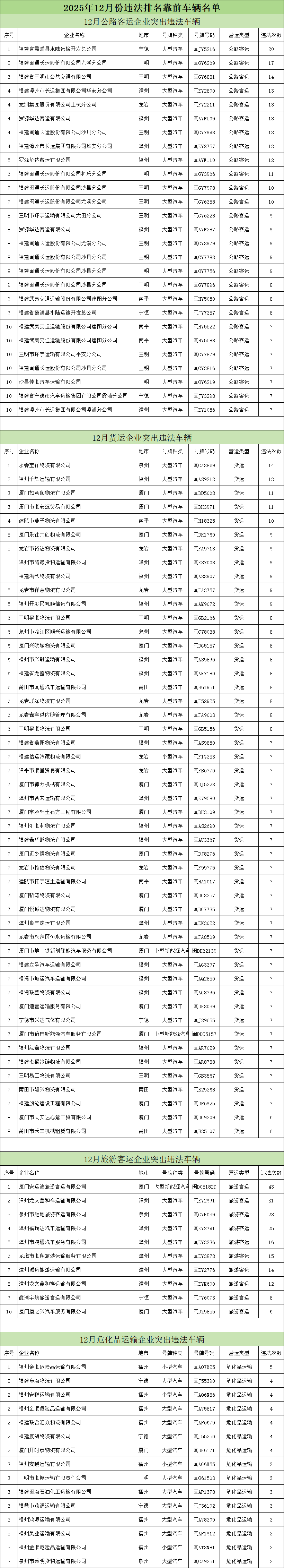 东南网2月4日讯(本网记者 翁莉 通讯员 陈浩)日前,省公安厅交通管理总队曝光2025年12月公路客运、普通货运、旅游客运、危险货物运输四类交通违法总量靠前的企业及车辆名单,通过公开警示,压实相关企业与驾驶人交通安全主体责任,推动源头隐患整治,全力防范交通事故,保障全省道路交通安全平稳。 当前冬季低温雨雪雾天气多发,福建山区路段易出现路面结冰、能见度降低等安全隐患,叠加春运客流集中、年底货运繁忙,交通安全风险上升。交警提醒:运输企业要强化驾驶人冬季培训,排查车辆隐患,严禁“带病车”上路;驾驶人应杜绝超速、酒驾、疲劳驾驶,恶劣天气减速控距、谨慎行车;广大群众出行选正规车辆,全程系好安全带,自驾提前检车备齐应急工具,遇拥堵事故服从指挥。交警部门将持续加大重点交通违法行为查处力度,呼吁社会各方协同发力,共同筑牢冬季及春运期间道路交通安全防线。