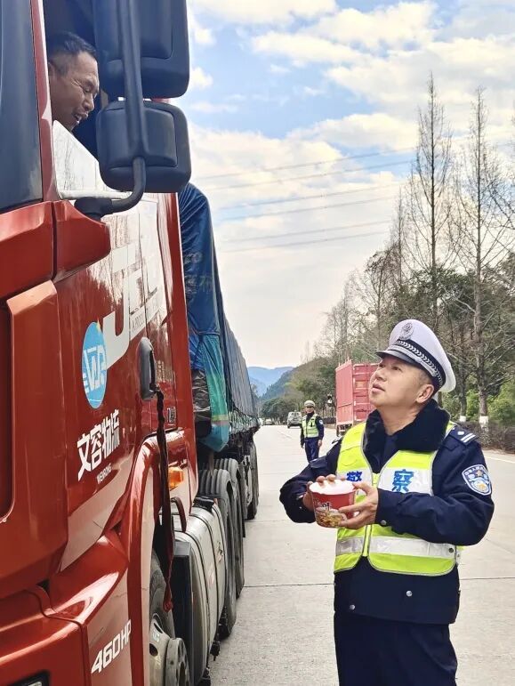 严格执法是责任,柔性服务是温情。执勤点民警在坚守岗位、严格执法、排查隐患的同时,将暖心服务融入春运执勤全过程,在各春运执勤点设立便民服务岗,为过往驾乘人员送上平安泡面、平安蛋、平安茶叶等提神暖心物品,及时缓解驾驶员长途奔波的疲惫,用实实在在的关怀温暖每一段春运归途,让奔波的旅途充满温情,切实传递交警的温度与担当。