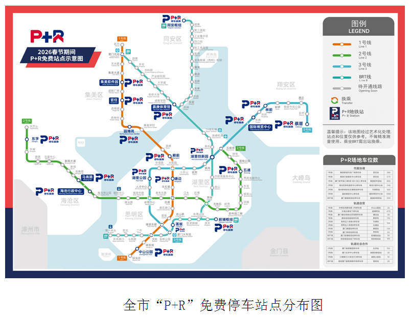 配套设施 全市2.4万个路内停车位(除环岛路沿线道路临时停车位外)全天免费开放。部分公交场站对外开放共享停车。全市布局21个“P+R”停车场,共5334个车位,供地铁换乘车主免费使用,可通过“厦门地铁”App等平台登记。