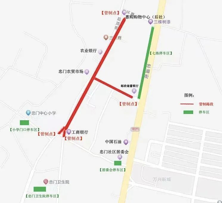 关于忠门街道实行临时交通管制的通告 为确保2026年春节期间忠门镇中心街道道路交通安全、有序、畅通,根据《中华人民共和国道路交通安全法》第三十九条之规定,决定对忠门镇中心街道部分路段实施临时交通管制措施。现将有关事项通告如下: 一、管制时间 2026年2月13日(农历腊月廿六)至2月24日(农历正月初八),每日7:30至18:00。 二、管制路段 (一)北环路与后顶街路口至海城路与忠门街路口 (二)忠门街与集贸路路口至集贸路与新文路路口