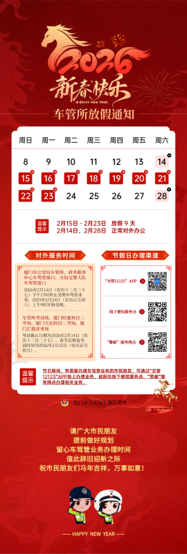 厦门交警:2026年春节期间车驾管业务对外服务时间提示