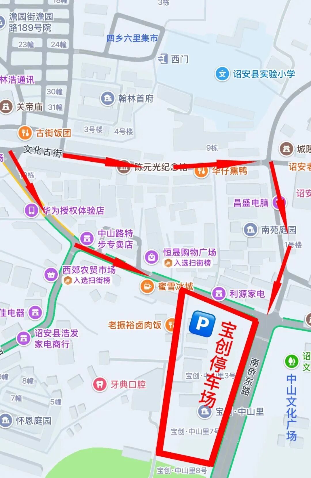 03 交通管制期间交通导流方案 (1)经南峰路口往中山路的车辆请往丹诏大道(南环城路)绕行。 (2)经县前路路口往中山路的车辆请往环城北路绕行。 (3)前往中山古城车辆停至宝创停车场或南峰停车场,前往四乡六里车辆可停至宝创停车场或规范停至路边停车位。