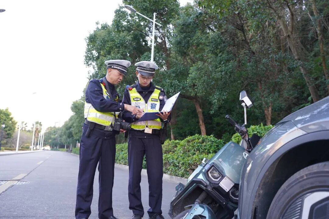 ▲周水生指导陶力川整理事故勘察记录 两人刚返回值班室,对讲机再次响起紧急呼叫:辖区育才路发生一起电动车逆行与小型汽车碰撞事故,需立即前往处置。来不及过多休息,两人再次火速赶往事故现场。抵达现场后,周水生第一时间查看双方驾驶人的伤情,叮嘱陶力川做好现场安全防护和交通引导,严防二次事故发生。确认两名驾驶人仅受轻微擦伤、无生命危险后,周水生细致开展现场勘查工作,结合事故现场情况,依法认定电动车驾驶人因逆行承担事故主要责任。